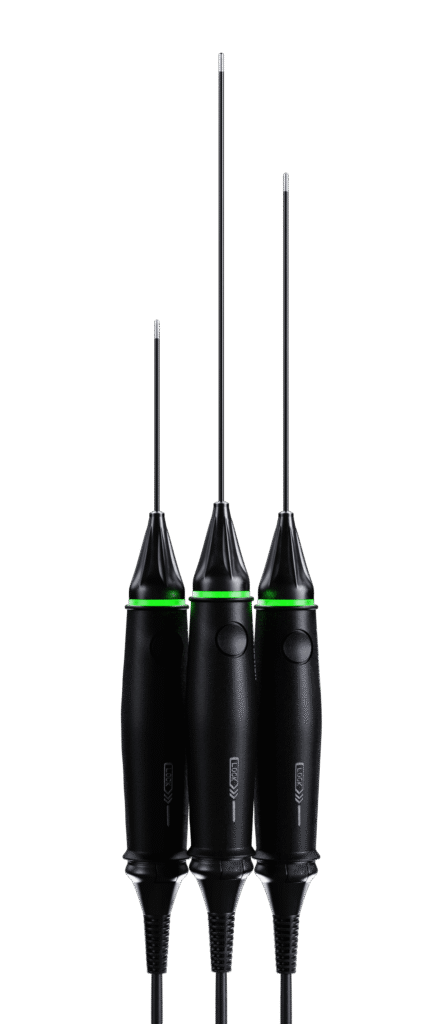 A ponta das cânulas é revestida com teflon, um material altamente resistente e condutor. É aí que a energia térmica RF é emitida.